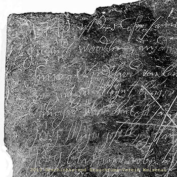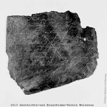 Es wird angenommen, dass die Schieferplatte bei diesen Arbeiten im Bauschutt gefunden und dann eingemauert wurde.