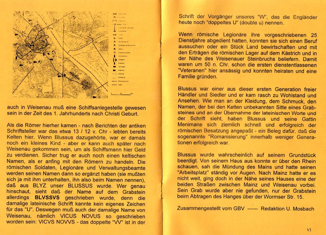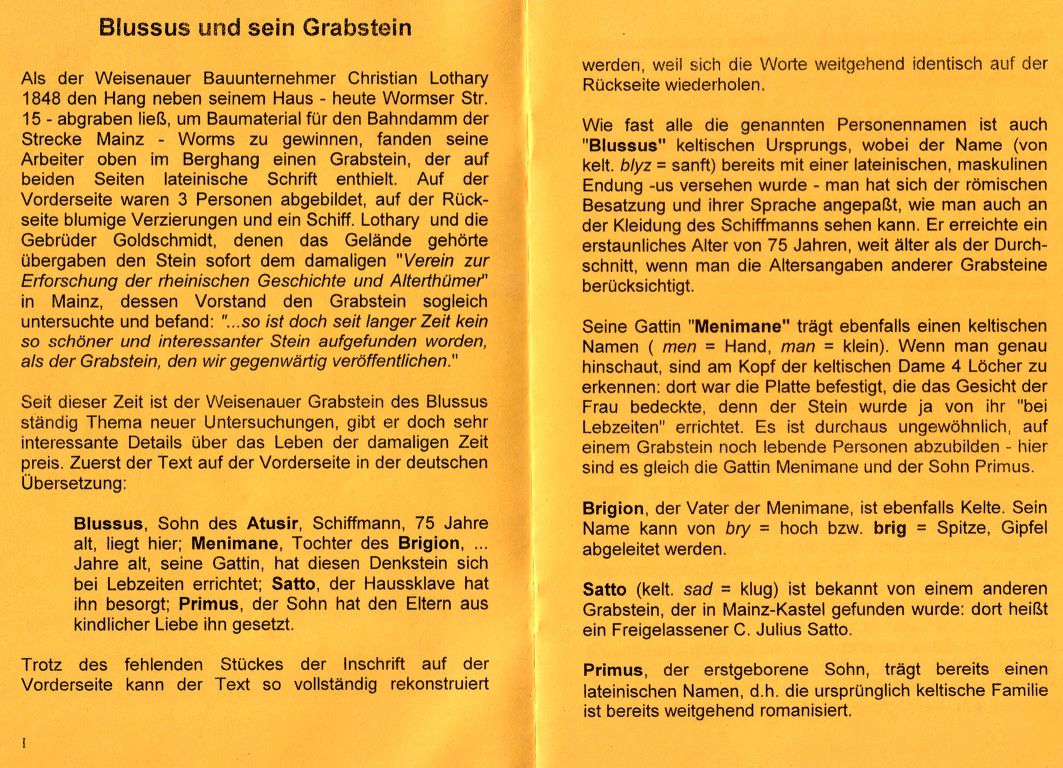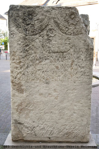 Natürlich ist der Blussusstein, der am Tanzplatz in Weisenau steht, nur ein Abguss - solch einen Fund könnte man nicht dauerhaft der Witterung aussetzen - der Verfall wäre zu groß. Das Original steht im Landesmuseum Mainz.